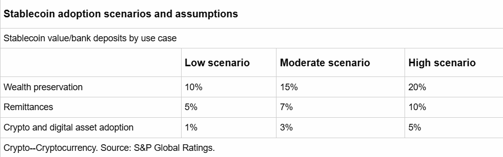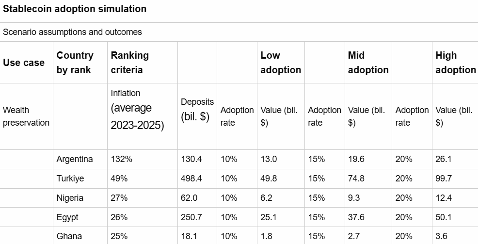 “Asumimos que la prohijamiento de monedas estables podría alcanzar entre el 10% y el 20% de los depósitos bancarios en los 15 principales países donde la preservación de la riqueza (poder adquisitivo) es el hacedor más importante”, señala el crónica.