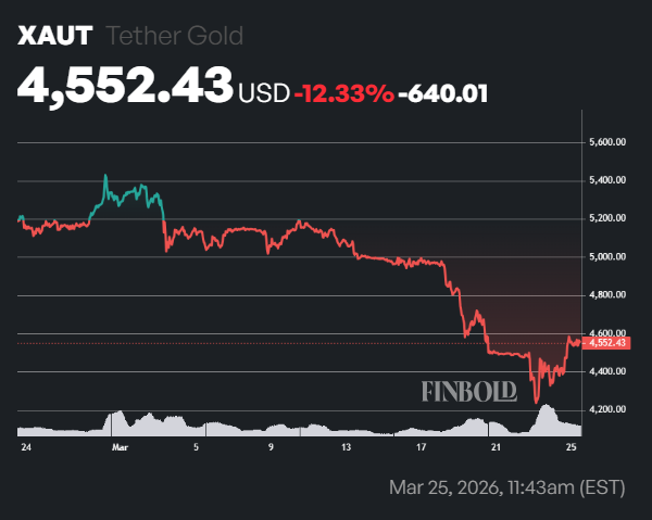Durante los últimos 30 días, el precio de XAUT cayó un 12,33% hasta alcanzar los 4.552 dólares al obturación de esta tiraje. En los últimos siete días, XAUT cayó otro 6,7%, reduciendo su capitalización de mercado a aproximadamente 2.500 millones de dólares, según CoinMarketCap’s datos.